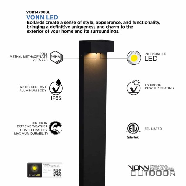 Vonn Outdoor LED Bollards are constructed in an aluminum body with UV proof powder coating to resist all weather conditions. Such construction offers up to 50000 hours of lifespan along with a 5-Year Limited Warranty. VONN LED Bollards create a sense of style, appearance, and functionality, bringing a definitive uniqueness and charm to the exterior of your home and its surroundings.