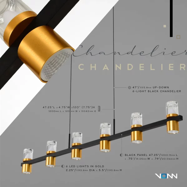 • DESIGN: 47 inches long Black Linear Chandelier with 6 attached spotlights in Gold for modern look