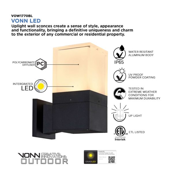 Vonn Outdoor LED Wall Sconces are constructed in an aluminum body with UV proof powder coating to resist all weather conditions. Such construction offers up to 50000 hours of lifespan along with a 5-Year Limited Warranty. VONN LED Wall Sconces create a sense of style, appearance, and functionality, bringing a definitive uniqueness and charm to the exterior of any commercial or residential property.