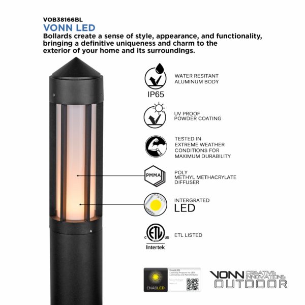 Vonn Outdoor LED Bollards are constructed in an aluminum body with UV proof powder coating to resist all weather conditions. Such construction offers up to 50000 hours of lifespan along with a 5-Year Limited Warranty. VONN LED Bollards create a sense of style, appearance, and functionality, bringing a definitive uniqueness and charm to the exterior of your home and its surroundings.