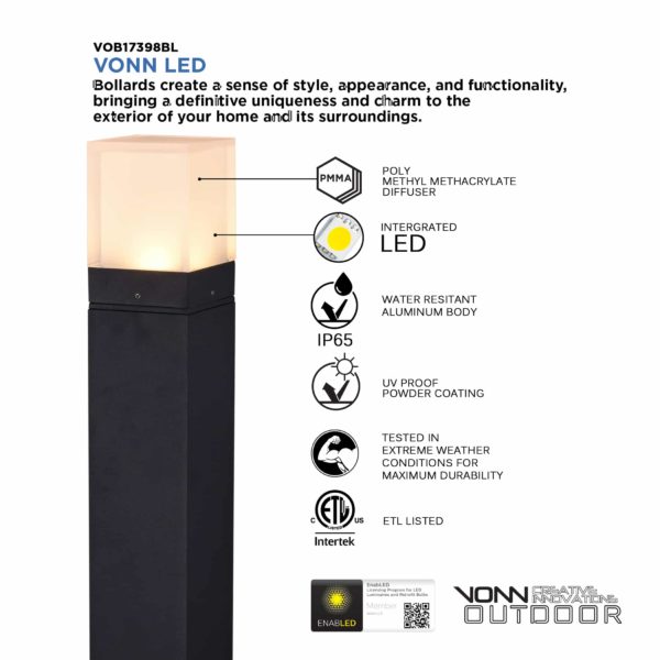 Vonn Outdoor LED Bollards are constructed in an aluminum body with UV proof powder coating to resist all weather conditions. Such construction offers up to 50000 hours of lifespan along with a 5-Year Limited Warranty. VONN LED Bollards create a sense of style, appearance, and functionality, bringing a definitive uniqueness and charm to the exterior of your home and its surroundings.