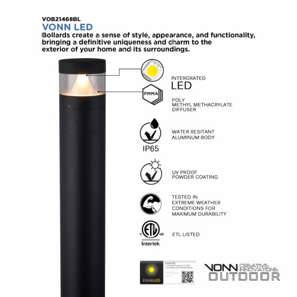 Vonn Outdoor LED Bollards are constructed in an aluminum body with UV proof powder coating to resist all weather conditions. Such construction offers up to 50000 hours of lifespan along with a 5-Year Limited Warranty. VONN LED Bollards create a sense of style, appearance, and functionality, bringing a definitive uniqueness and charm to the exterior of your home and its surroundings.