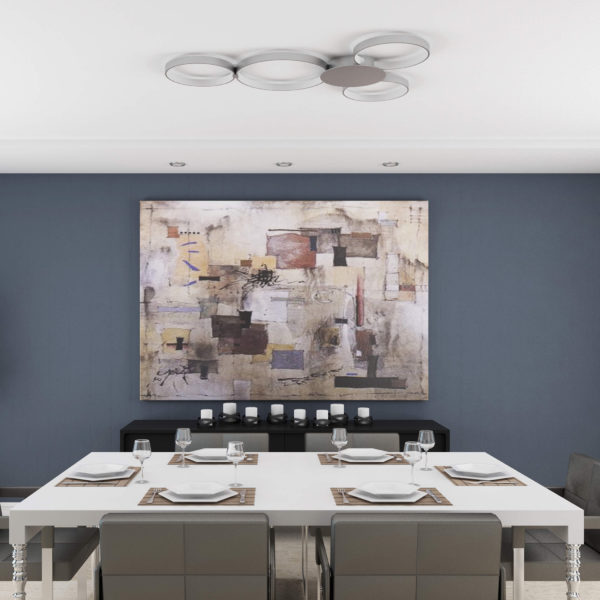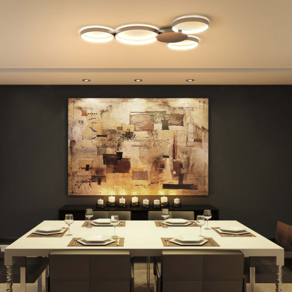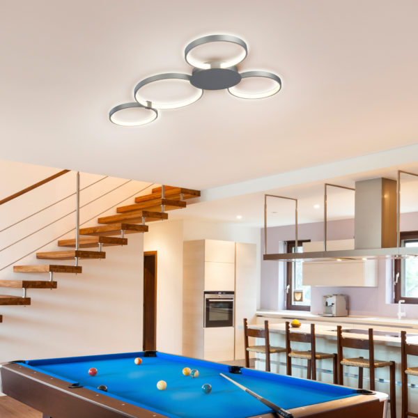 • UNIQUE DESIGN: Four-ring modern LED ceiling fixture with indirect, interior glow, and outward finished-aluminum face