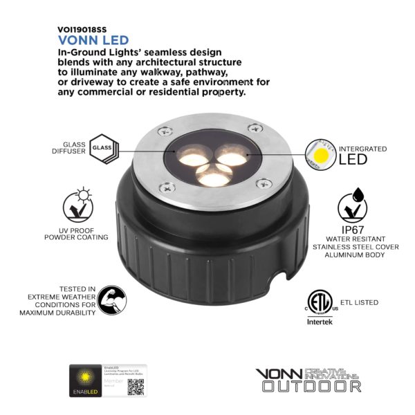 Vonn Outdoor LED In-Ground Lights are constructed in stainless steel top plate and aluminum body with UV proof powder coating to resist all weather conditions. Such construction offers up to 50000 hours of lifespan along with a 5-Year Limited Warranty. VONN LED In-Ground Lights’ seamless design blends with any architectural structure to illuminate any walkway, pathway, or driveway to create a safe environment for any commercial or residential property