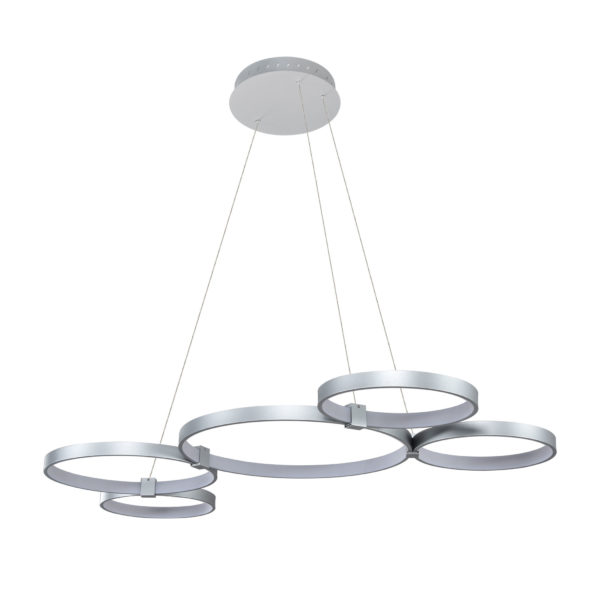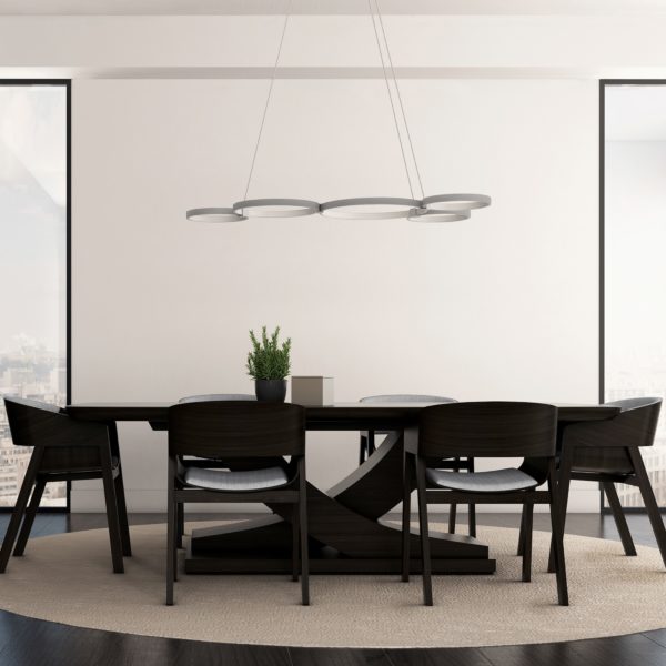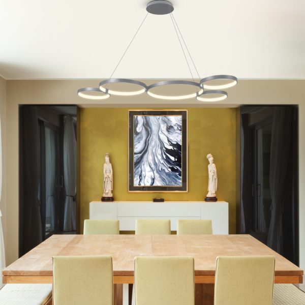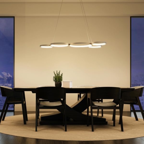 • UNIQUE DESIGN: Five-ring modern LED chandelier with indirect, interior glow, and outward finished-aluminum face