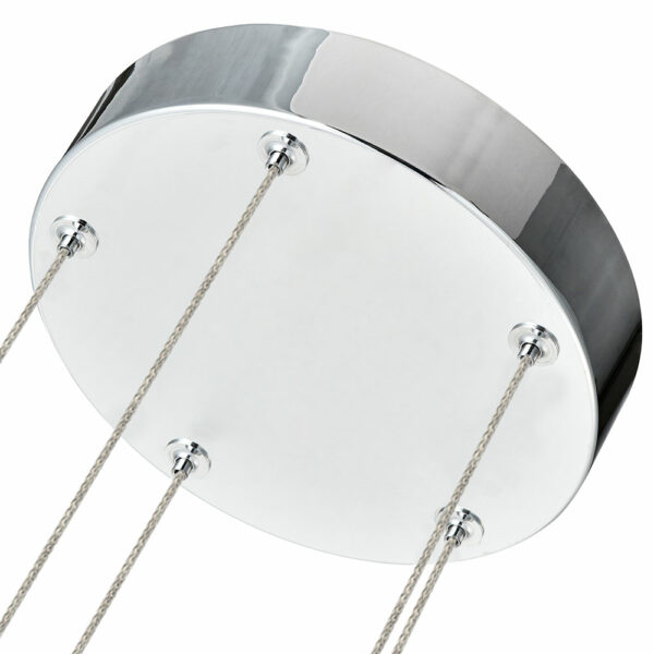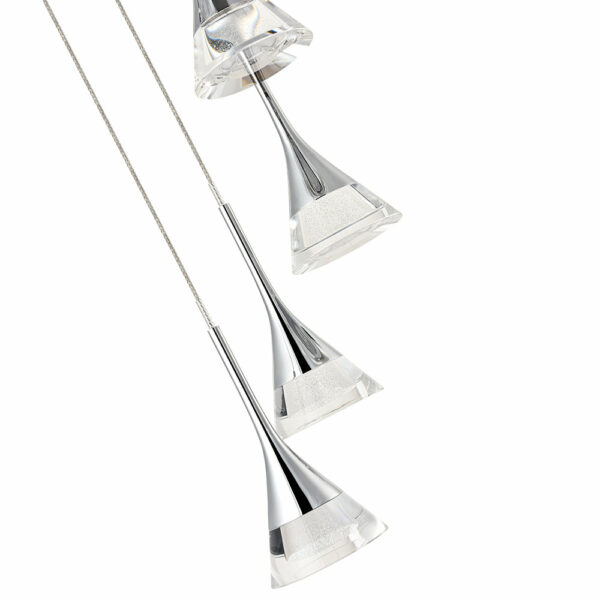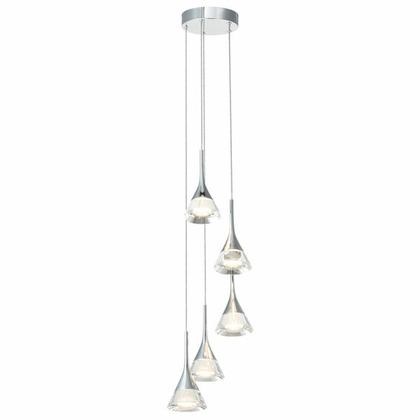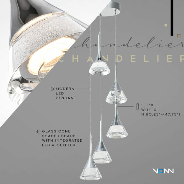 • DESIGN: Modern chandelier with 5 cone shaped acrylic shades. The shades are clear with glitter accent and polished chrome top. Canopy is polished chrome.