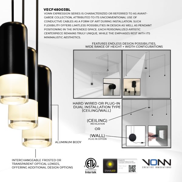 VONN Expression Series is characterized or referred to as Avant- Garde Collection, attributed to its unconventional use of conductive cables as a form of art during installation. Such flexibility of configurable lighting offers limitless possibilities in design as well as pendant positioning in the intended space. Each personalized artistic centerpiece remains truly unique, while the emphases rest with its minimalistic aesthetics.