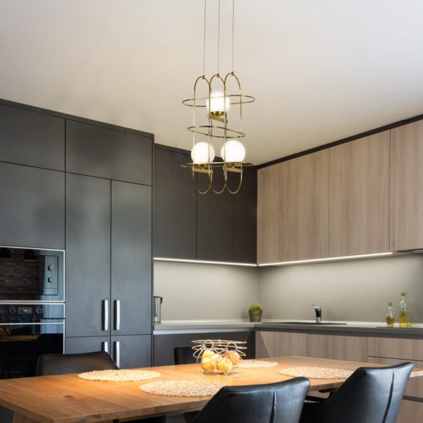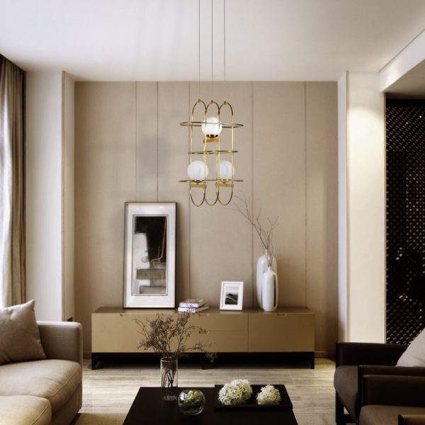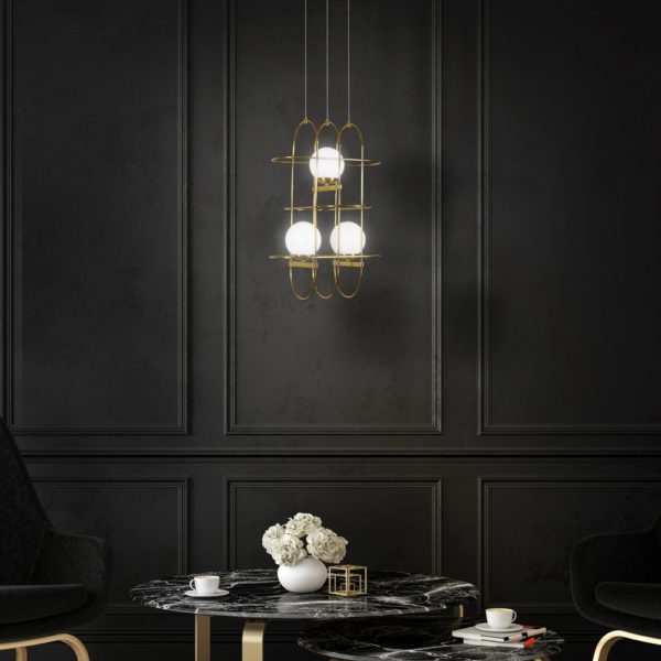 • DESIGN: Modern Chandelier with Aluminum Wire Frame and White Frosted Glass Ball Shaped Shades