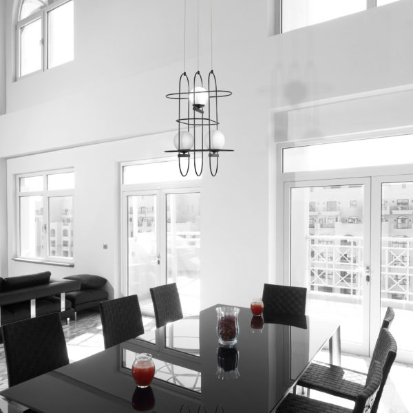 • DESIGN: Modern Chandelier with Aluminum Wire Frame and White Frosted Glass Ball Shaped Shades