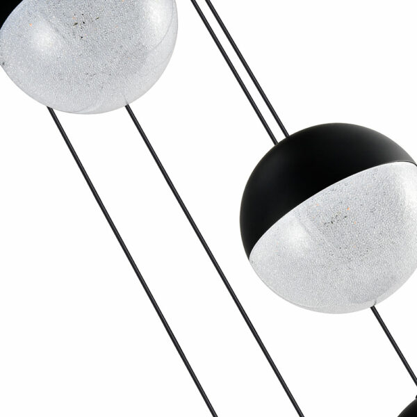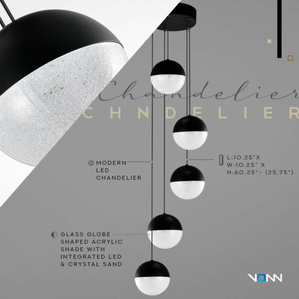 • DESIGN: Modern chandelier with 5 ball shaped acrylic shades. The shades have black top and white bottom with crystal sand inside. Canopy is black.