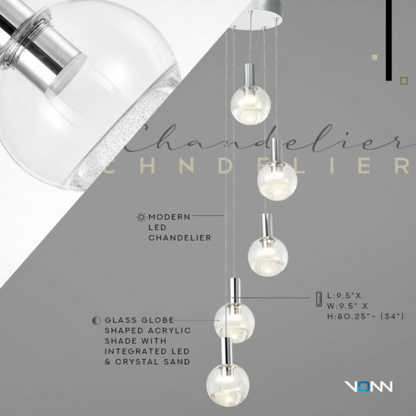 • DESIGN: Modern chandelier with ball shaped glass shades. The glass shades are clear with glitter accent and polished chrome top. Canopy is polished chrome.
