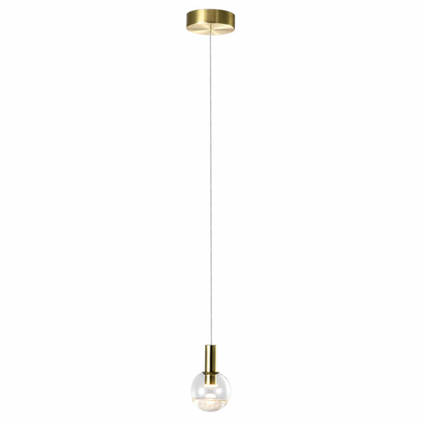 • DESIGN: Modern pendant with ball shaped glass shade. The glass shade is clear with glitter accent and brass top. Canopy is brass.