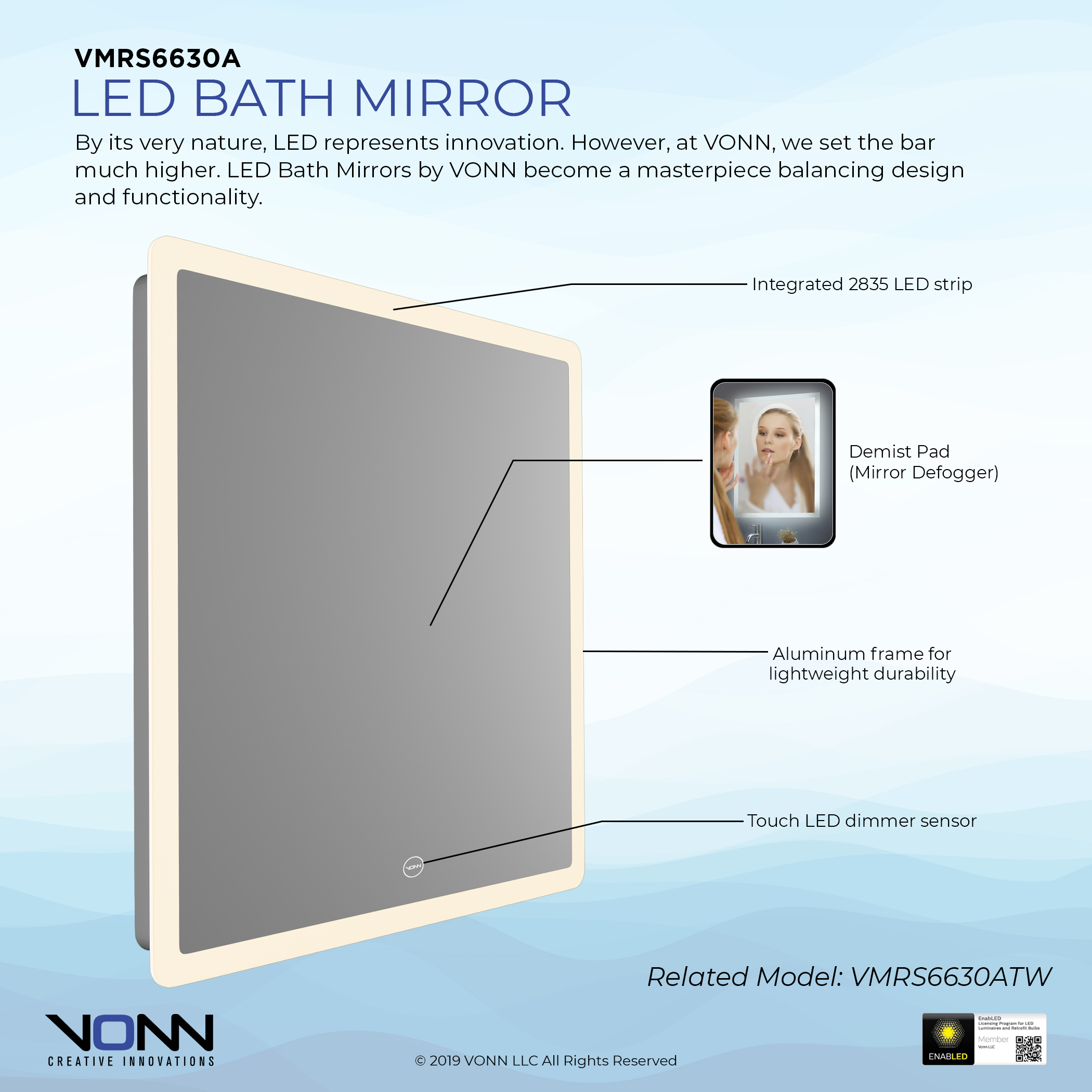 1. 4mm copper-free silver mirror, ambient 2. Aluminum frame 3. Color Temperature: 3000K, 4000K, 5000K, 6000K 4. 2835 LED light strip
